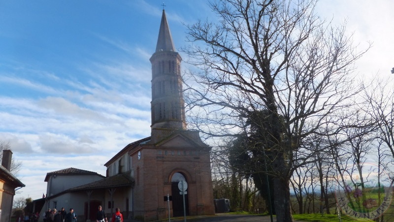 Après une semaine pluvieuse, c’est un temps printanier qui va nous accompagner pour notre rando qui part du petit village de Pelleport. Nous sommes 26 courageux marcheurs prêts à affronter les divers chemins gorgés d’eau. Nous démarrons à 14h40 par la petite route qui descend doucement. Par un petit pont nous traversons le ruisseau du Boué qui coule avec un courant fort et forme une grosse cascade d’une couleur marron. La route remonte légèrement jusqu’à un croisement où nous allons prendre le chemin herbeux. Étant un peu en hauteur, nous avons droit à une belle vue de tous ces champs vallonnés. Le chemin redescend un peu raide, c’est donc prudemment que nous descendons car le chemin est très glissant. Nous arrivons à un petit lac où se jette le ruisseau de la Reyre, petite halte pour se regrouper avant d’amorcer le chemin qui remonte jusqu’aux Gilets. Petite pause pour se désaltérer et nous voilà repartis par une petite descente avant d’attaquer une belle montée un peu longue jusqu’au village ‘’Le Grès’’. Par le chemin d’Enguinot nous traversons le village, passons devant l’église Notre-Dame du Grès et son beau clocher octogonal. Nous quittons ce petit village et par un chemin de terre descendons jusqu’au ‘’Las Gachounos’’.
