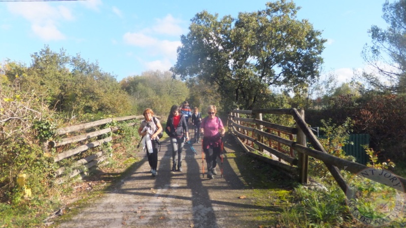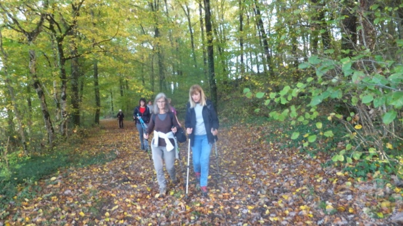 Qui aurait cru, vu la journée de Jeudi, qu'aujourd'hui nous allions avoir un si bel après-midi pour notre rando qui part du petit village de la Magdelaine-sur- Tarn. Soleil généreux, ciel bleu et température douce étaient au rendez-vous. Nous sommes 35 à démarrer à 14h35 du parking du terrain de sport du village. Nous prenons la route qui descend légèrement, passons devant un magnifique pigeonnier tout en briques roses et traversons de grands champs où certains sont semés de Colza qui commence à sortir du sol. Nous arrivons à l'ancienne voie ferrée de Montauban à St-Sulpice qui a été transformée en voie verte, c'est un large chemin goudronné, ce qui nous permet de bien chatter. Un peu plus loin, en contre-bas, nous prenons un chemin herbeux qui longe toujours la voie verte. Nous quittons cette voie pour prendre un joli chemin dans un petit bois dont le sol est jonché de feuilles mortes. Nous laissons les cinq chemins et arrivons au centre équestre du Roc de Bélesta. C'est un large chemin empierré que nous prenons jusqu'à La Peyrolière où quelques petites flaques d'eau nous rappelle la pluie de la veille. Par un petit pont nous traversons le ruisseau de Martigues et arrivons à un chemin au milieu de quelques épineux et bosquets où se cache un grand lac que nous longeons pour arriver à un grand centre de loisirs où se trouve de nombreux jeux pour les enfants. Notre rando touche à sa fin et c'est à 17h05 que se termine cette balade de 10km parcouru finalement à travers divers chemins sans boue. Avant de prendre le chemin du retour vers St-Jory c'est un copieux goûter qui nous est offert par les randonneurs nés en Juillet, Août et Septembre avec, de délicieux gâteaux accompagnés de bière, jus de fruits et vin blanc. Moment très convivial qui clôture cette journée.